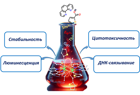 Междисциплинарный коллектив ученых (химики, физики, биофизики и медики) из Москвы и Санкт-Петербурга разработал серию комплексов редкоземельных металлов (лантаноидов) с анионами тиофенкарбоновой кислоты и фенантролином, которые не только обладают выраженными люминесцентными свойствами, но и проявляют высокую противоопухолевую активность в отношении раковых клеток яичников (SKOV3), молочной железы (SKBR3), колоректального рака (HCT116) и рака легких (A549). Также удалось изучить возможное связывание комплексов с ДНК и стабильность соединений в водном растворе.