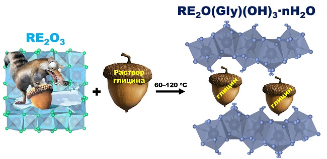 ![]() Схема взаимодействия оксидов редкоземельных элементов с водными растворами глицина в мягких условиях (60°С–120°C) с образованием новых слоистых соединений — оксогидроксоглицинатов редкоземельных элементов (RE – редкоземельный элемент; Gly – глицин)
